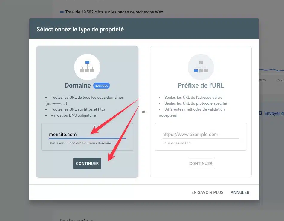 Pour une Propriété de Domaine : La vérification DNS reste la seule option disponible. Vous devez ajouter un enregistrement TXT dans les paramètres DNS de votre registraire de domaine.
