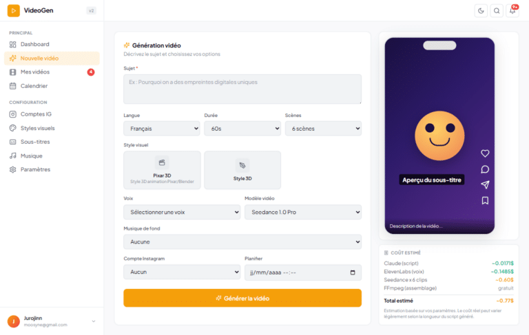 VideoGen — Plateforme de génération automatique de vidéos IA pour Instagram
